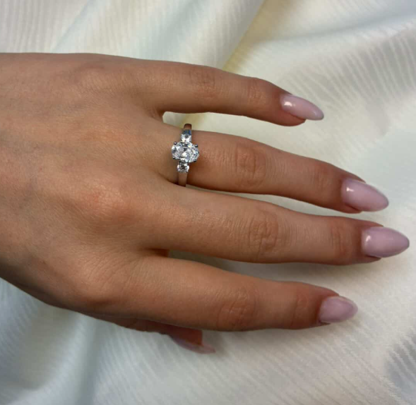 14 karat diamant ring med ialt 1,33 ct lab grown diamanter TW/VS - 1 ct oval center sten med to sidesten på ialt 0,33 ct fattet i firgrab fatninger.