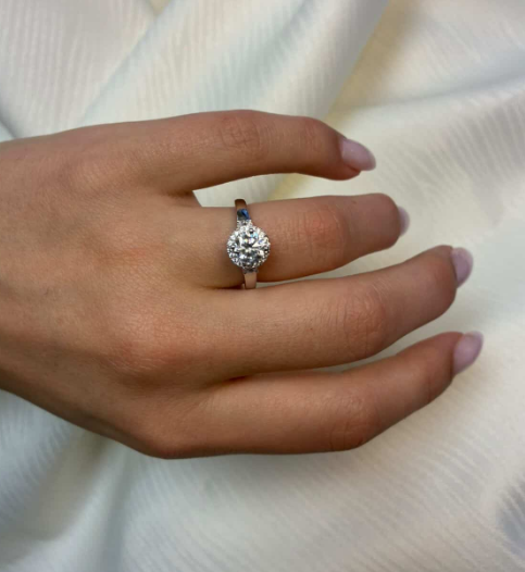 14 karat diamant ring med ialt 1,45 ct lab grown diamanter TW/VS - 1 ct rund center sten med ialt 0,45 ct diamanter rundt om center stenen og på ringskinne.
