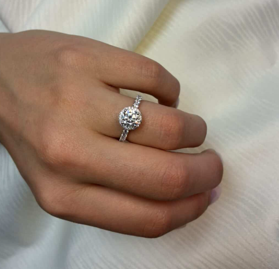 14 karat diamant ring med ialt 1,52 ct lab grown diamanter TW/VS - 1 ct rund center sten med ialt 0,52 ct diamanter rundt om center stenen og på ringskinne.