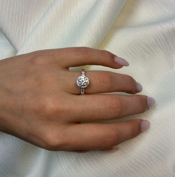 14 karat diamant ring med ialt 1,32 ct lab grown diamanter TW/VS - 1 ct rund center sten med ialt 0,32 ct diamanter rundt om center stenen og på ringskinne.