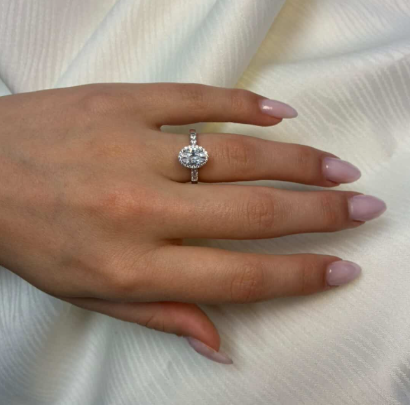 14 karat diamant ring med ialt 1,32 ct lab grown diamanter TW/VS - 1 ct oval center sten med ialt 0,32 ct diamanter rundt om center stenen og på ringskinne.