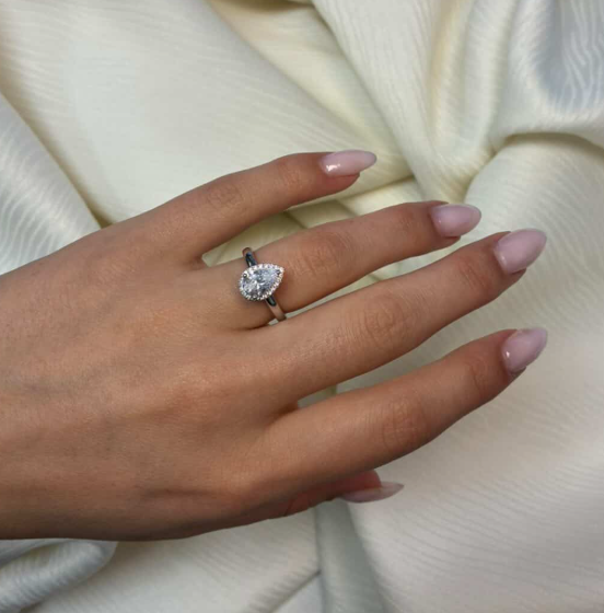 14 karat diamant ring med ialt 1,12 ct lab grown diamanter TW/VS - 1 ct dråbe formet center sten med ialt 0,12 ct diamanter rundt om center stenen og på ringskinne.