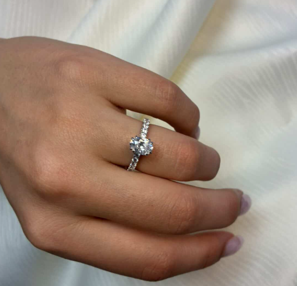 14 karat guld diamant ring med ialt 1,4 ct lab grown diamanter TW/VS - 1 ct oval center sten og 10 sten på ringskinne.