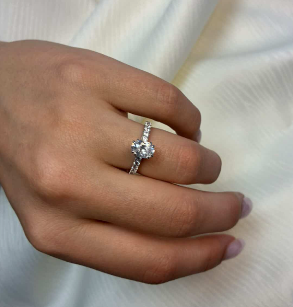 14 karat hvidgulds diamant ring med ialt 1,4 ct lab grown diamanter TW/VS - 1 ct oval center sten og 10 sten på ringskinne.