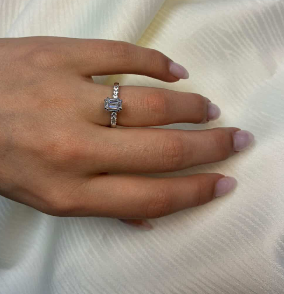 14 karat guld diamant ring med ialt 1,2 ct lab grown diamanter TW/VS - 1 ct firkantet center sten og 6 sten på ringskinne.