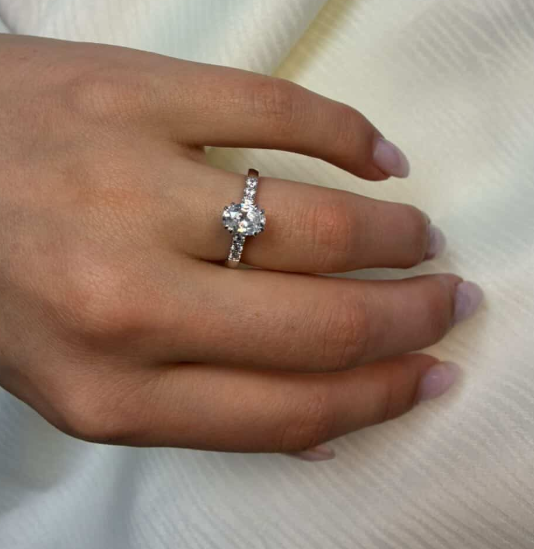 14 karat guld diamant ring med ialt 1,2 ct lab grown diamanter TW/VS - 1 ct oval center sten og 6 sten på ringskinne.