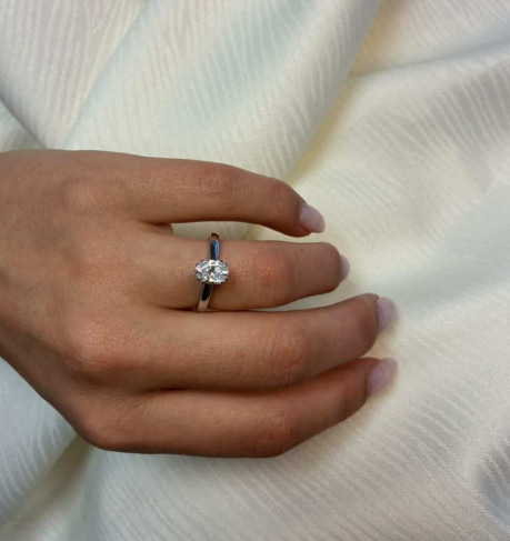 14 karat guld diamant ring med ialt 1,0 ct lab grown diamanter TW/VS - 1 ct oval center sten og glat ringskinne.