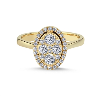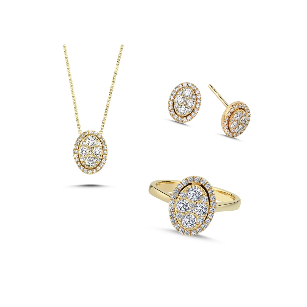 Posh smykkesættet med ovalt vedhæng, ovale ørestikkere og oval ring er i 14 karat guld med Wesselton SI brillianter smukt fattet med detaljeret fatninger og 42 cm kæde til vedhænget.