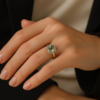 Centralt i denne imponerende ring sidder en betagende grøn ametyst, kendt for sin vibrerende farve og dybde, som symboliserer ro, balance og klarhed. Omkranset af ægte 0,085 ct diamanter i kvaliteten W/SI, tilføjer dette stykke en uovertruffen glans og glamour, der fanger øjet ved enhver lejlighed.